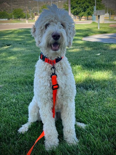 Charlie is a F1b Miniature Goldendoodle. He is 35 lbs, good natured, playful and lives with his guardian family here in San Diego.